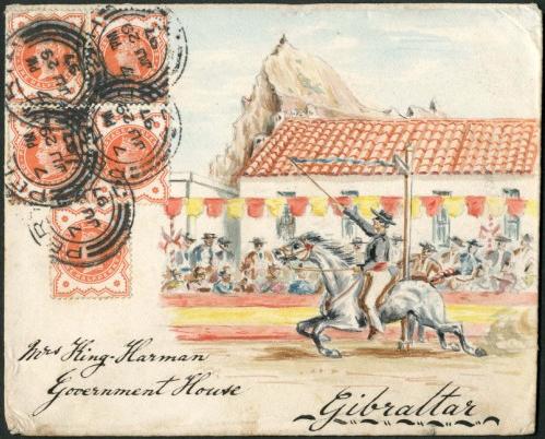 1897 (Jun 29) Envelope sent from Perth to King-Harman in Gibraltar, with five 1/2d vermilions and an illustatration of a fiesta scene with man on horse and the Rock in the background, arrival bs