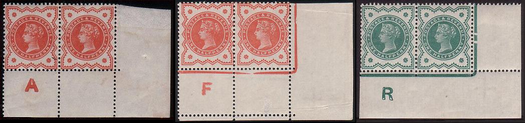 Both the 1/2d vermilion and 1/2d green had a control letter (from A to Q on the vermilion progressing in alphabetical order, and R on the green) printed below the 119th stamp in the sheet, which were used by De La Rue to maintain records of the use of the paper supplied for the printing of the stamps. Only the early printings of the vermilion were without control, and are these are the hardest to find (see examples).
