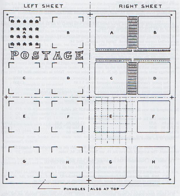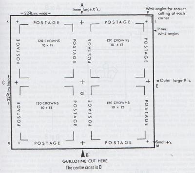 The 4d, 4 1/2d, 9d and 10d values were printed on the same paper but in 320 set (fig. 5), in 16 panes of 20. The same features, shown separately for clarity, are on both halves and all appropriate parts of the mill sheet. The dotted lines joining the watermark crosses show how sheets were cut before issue. Identification of the left and right sheets is the same as for the 480 sheets. The letters on the diagram on each pane are philatelic identifying letters.