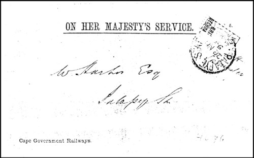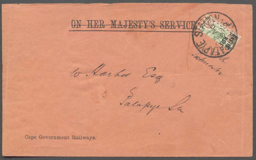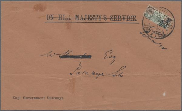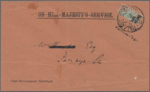 1899 (Nov 22) OHMS Cape Government Railways envelope (creases and a few other faults) addressed locally with 1891 4d vertical bisect tied by Palapye station cds with signature of D. Solomon, Postmaster alongside (reverse)