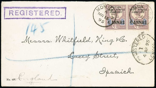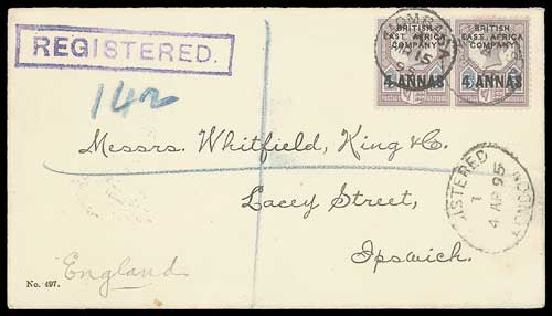 1895 (May 9) “Whitfield King & Co” envelope from Mombassa to England with 1890 4a on 5d pair, cert. Holcombe (1996)