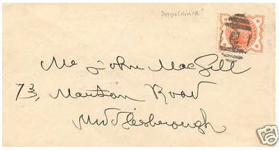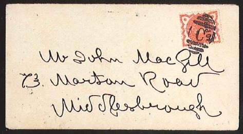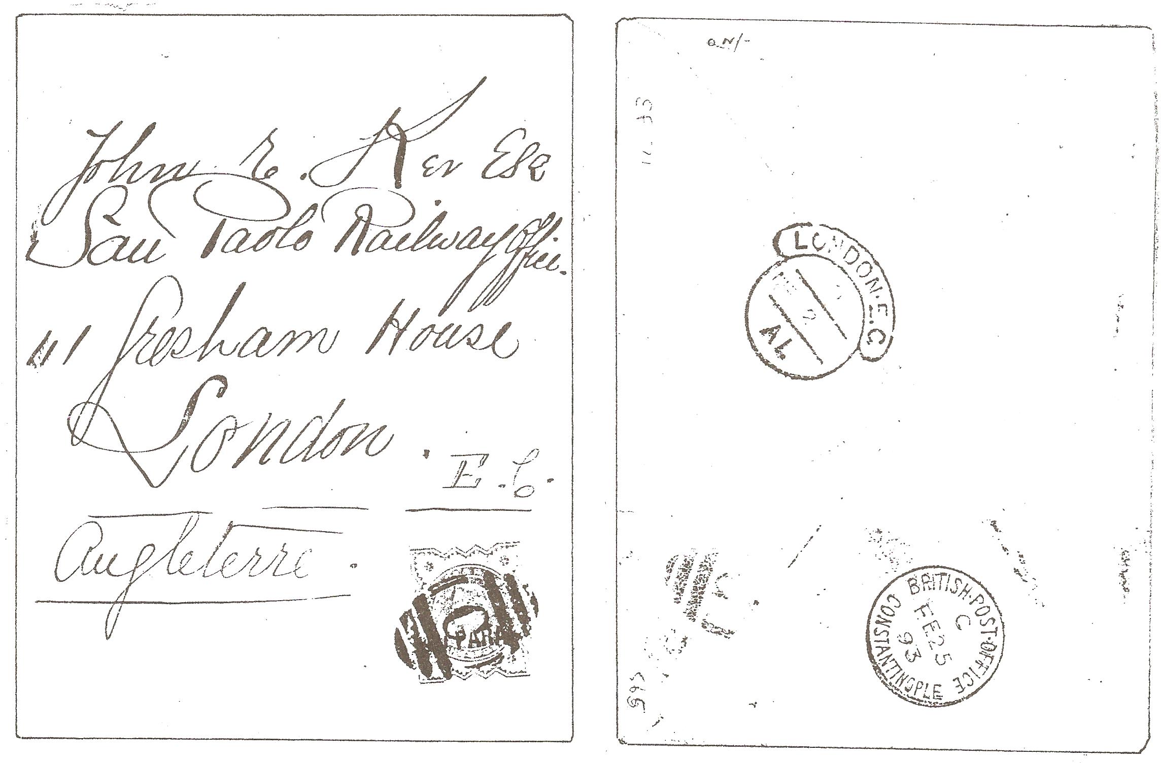 1893 (Feb 25) Envelope from Constantinople to Middlesbrough (England), with 40pa on 1/2d vermilion tied by “C” obliterator, reverse with Constantinople and Middlesbrough cds