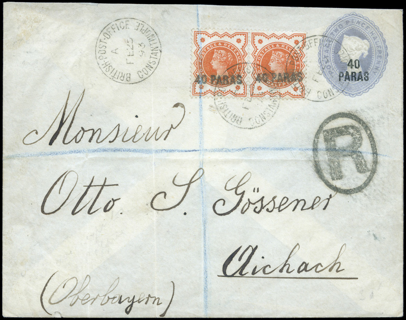 1893 (Feb 25) Envelope from Constantinople to Middlesbrough (England), with 40pa on 1/2d vermilion tied by “C” obliterator, reverse with Constantinople and Middlesbrough cds, cert. BPA (1949)
