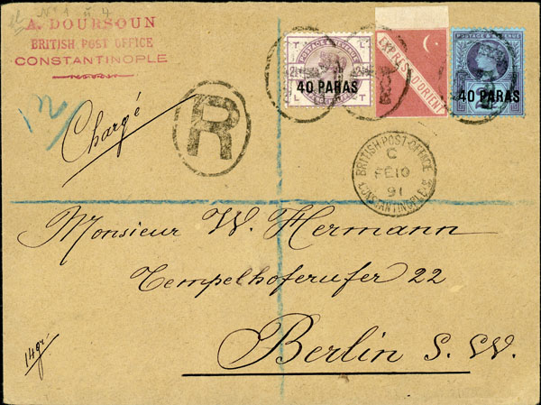 1890 (Dec 5) Envelope sent registered from Constantinople to Germany with red “EXPRESS D’ORIENT” label and 40pa on 2 1/2d and 80pa on 5d, some wear and a few peripheral tears reinforced with staining old sellotape; not affecting red label