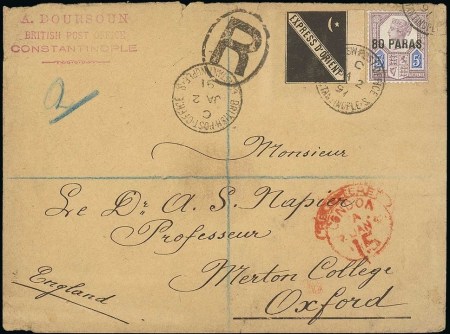 1891 (Jan 2) Envelope registered from Constantinople to Oxford, showing Doursoun British Post Office cachet and upper left and bearing 80pa. on 5d. in combination with Die II label in black (marginal), both neatly cancelled and tied by British Post Office datestamp and with another strike and oval-framed “R” alongside, London Registered hooded datestamp at foot, arrival datestamp (7.1) on reverse, fine. Cert. BPA (2001)