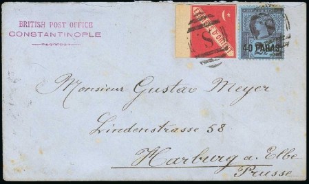 1890 (Mar 1) Envelope from Constantinople to Harburg, Prussia, showing British Post Office Constantinople cachet at upper left and bearing 40pa on 2½d in combination with Die II label in rose (marginal), both neatly cancelled “S.” in oval of bars, Constantinople British Post Office and arrival (5.3) on reverse. Cert. RPS (1997)