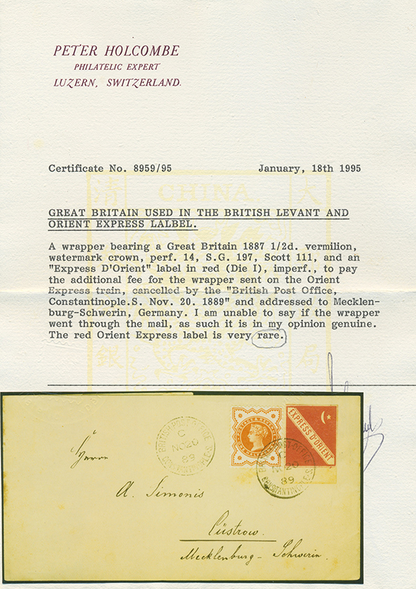1889 (Nov 20) Envelope with red Orient Express label and GB 1887 1/2d vermilion sent to Germany, cert. Holcombe (1995)