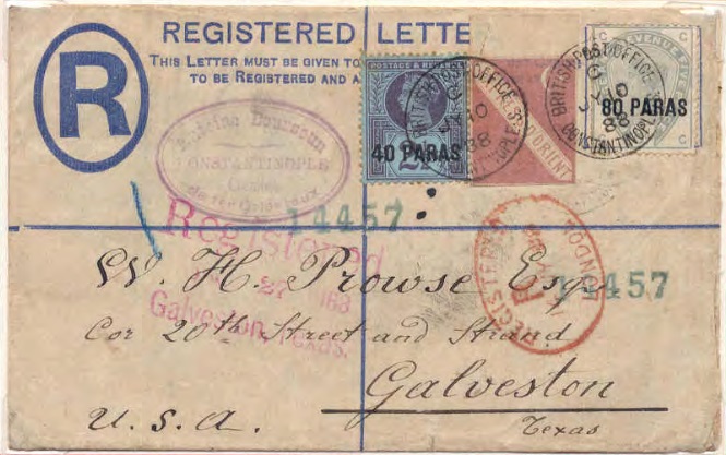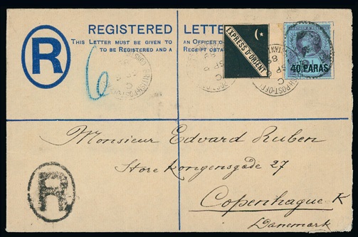 1889 (Feb 9) GB 2d registered envelope from Constantinople to Denmark with red “EXPRESS D’ORIENT” label and 40pa on 2 1/2d, cert. BPA (2004)