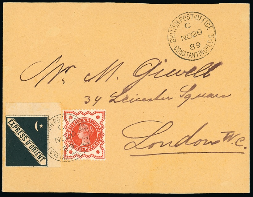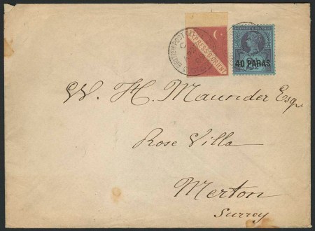 1889 (Apr) Envelope to UK with “Express D’Orient’ label in rose alongside 1887 40pa on 2 1/2d, both tied with clear “S” (Stamboul) barred oval, cover faults, reduced at foot. Cert. RPS (1974)
