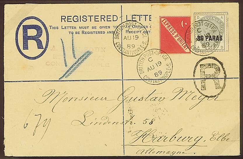 1892 (Aug 31) GB 2d registered envelope (1883 issue, RP 13H) from Constantinople to Germany uprated with 80pa on 5d (3) and “EXPRESS D’ORIENT” label, the only example of this H size envelope recorded.