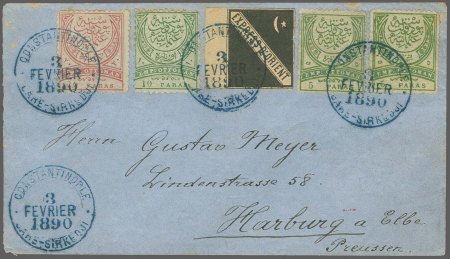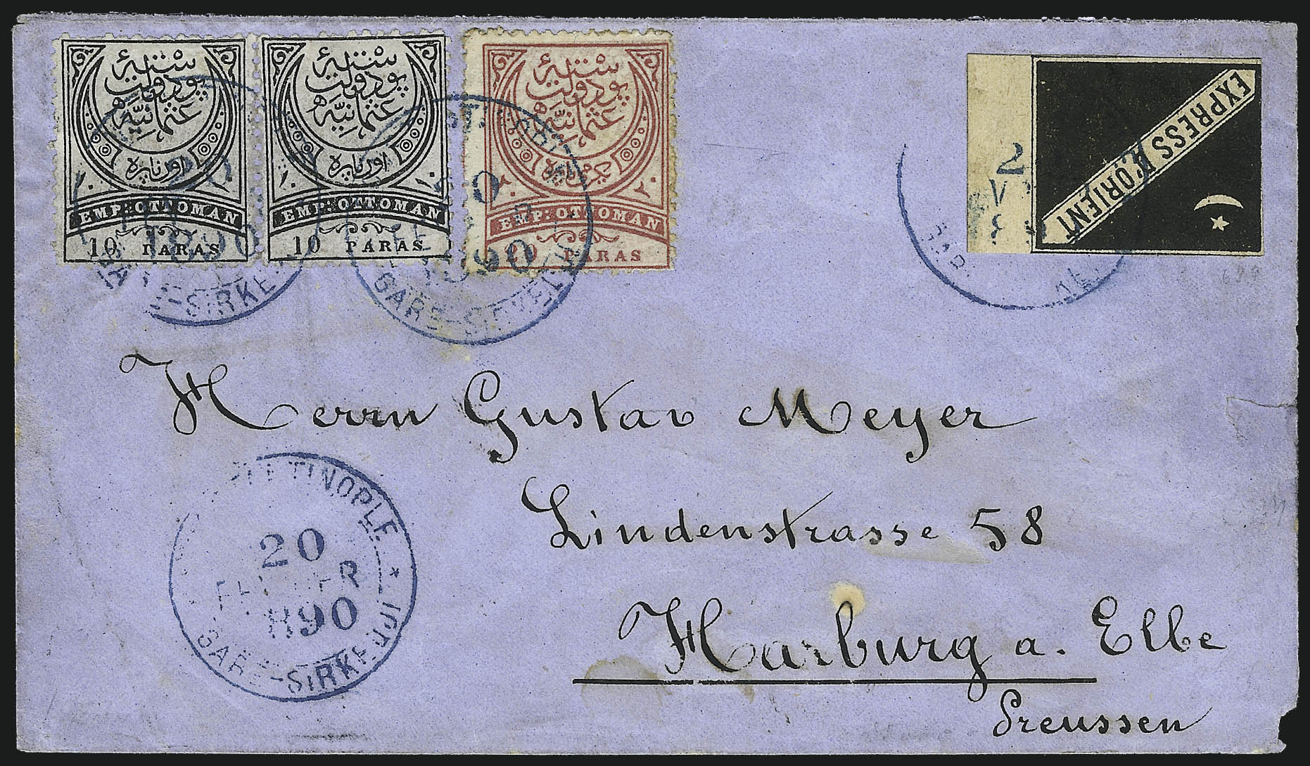 1890 (Feb 20), Cover addressed to the known correspondence of Gustav Meyer in Hamburg with black Express D’Orient label with sheet margin at right and just touching at left, tied by “Constantinople Gare-Sirkedji, 20 Fevrier 1890” circular datestamp, Hamburg arrival backstamp, cert. Du Vachat (1997)