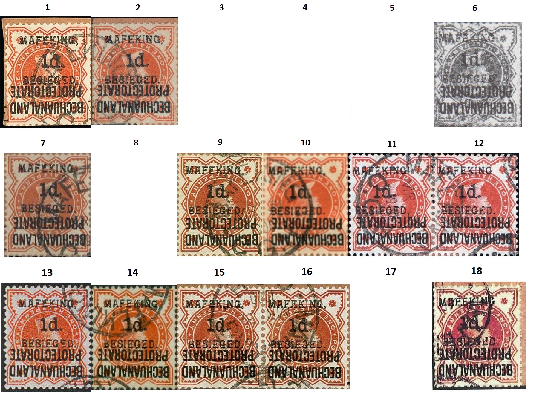 “A stamp that calls for special comment is the 1d. on 1/2d. Bech. Prot, with inverted surcharge. As only five or six copies of this variety have turned up, it is undoubtedly the rarest stamp on the page. I would also point out that the figure of value of the surcharge of some of the ” fancy capitals” varieties is not always placed in the same position. Five times out of six it falls under the “EK” and “I” of “MAFEKING.” Copies are, however, occasionally met with where the 1d. is printed more to the left, and falls under the “FE” of “MAFEKING.”