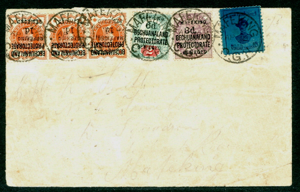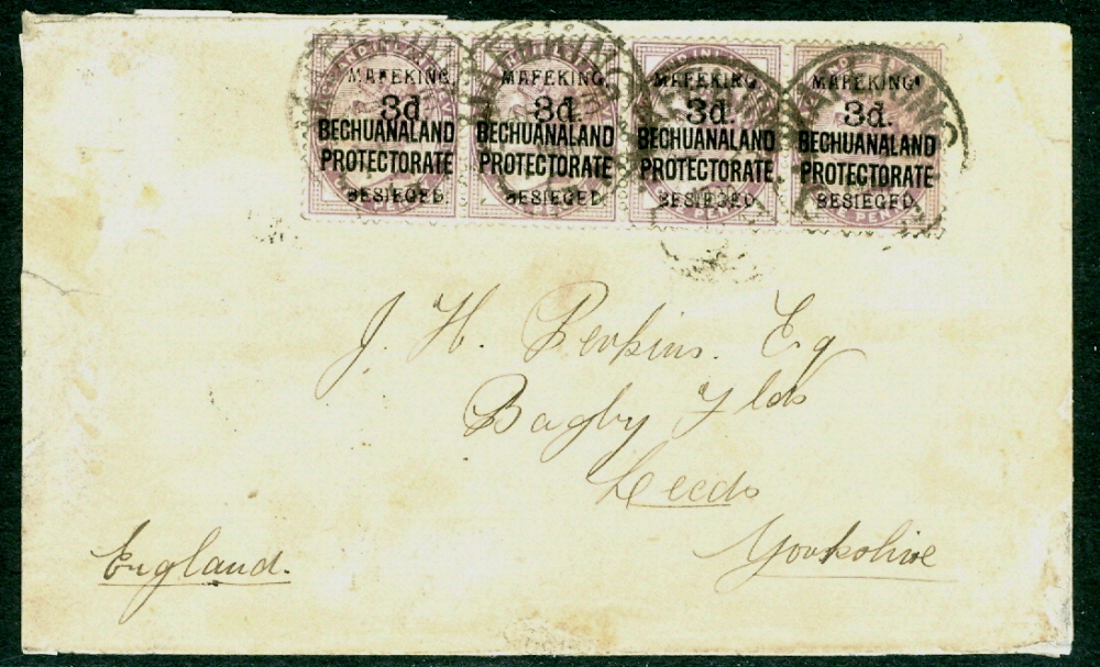 A magnificent strip of four 3d on 1d lilac used on cover to Leeds, backstamped ‘BULAWAYO’ and ‘Leeds’, cert. David Brandon.