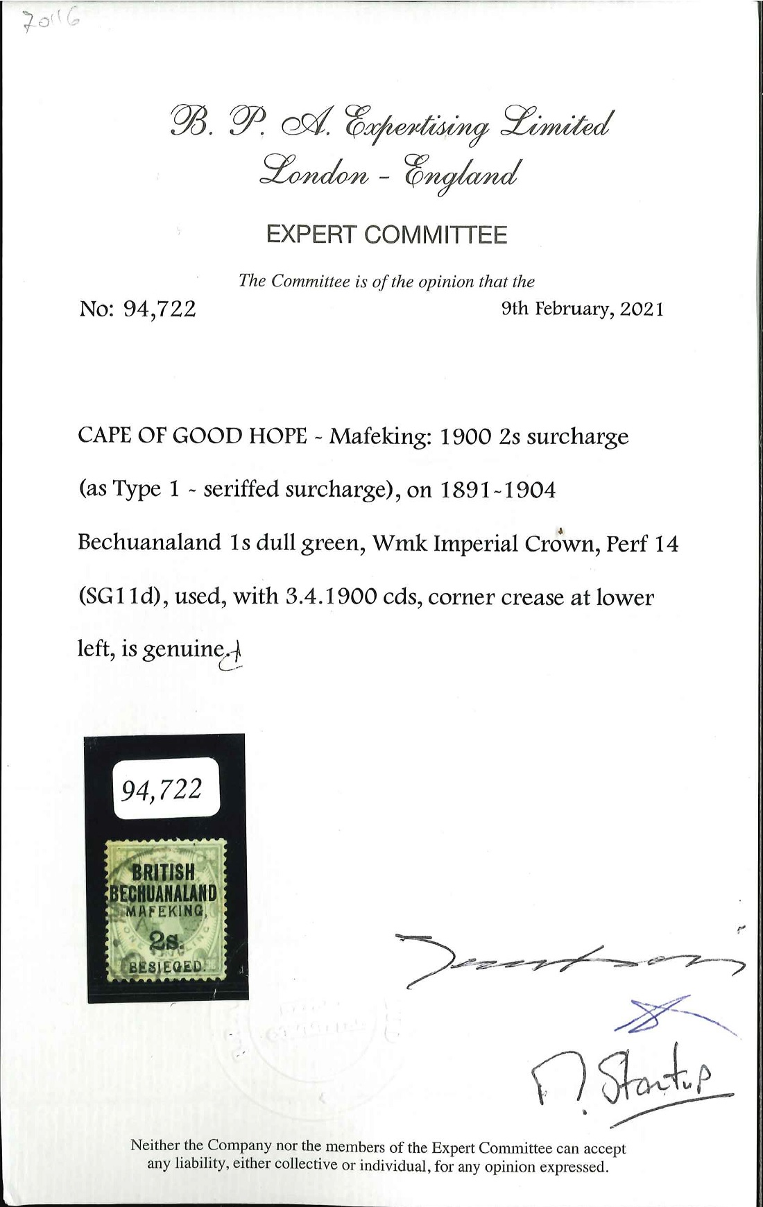 Following its discovery it was decided to seek further opinions and was sent to two leading students in the field of Mafeking Siege Stamps and Boer War philately. One of these specialists provided information that another example was offered in Auction in 1970 as a normal and also has a April 1900 cancel. The second consultant agreed it was genuine but probably an essay. This could be correct as the British Bechuanaland 4d was surcharged 1s with both types of font as a double surcharge. This is a known practice of some jobbing printers of that era deliberately overprinting a subject twice with either different type or different inks.