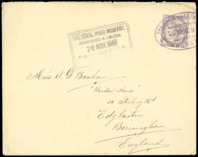 Most of the recorded covers come from the same correspondence from Alex J. Braham, who was originally from Birmingham and worked as a district agent of the Royal Niger Company in Anambra. He claimed to be the first white man to travel from Idah on the River Niger to Ogrugu overland.