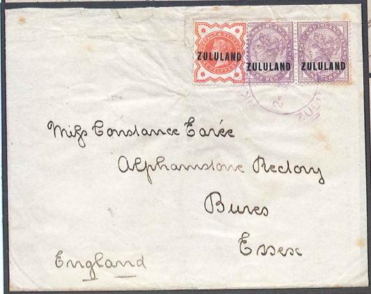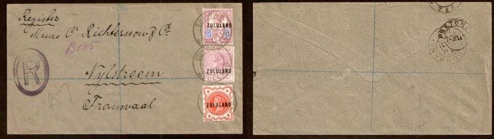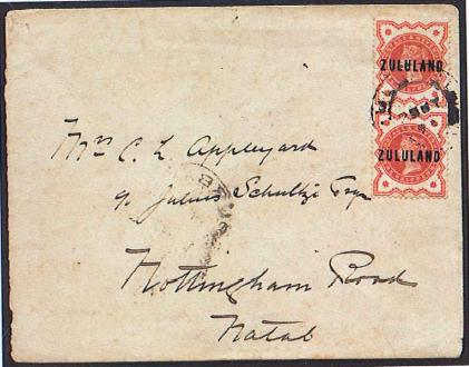 1894 (Jul 25) Envelope to Natal with 1/2d vermilion pair tied by fair Ulundi cds, reverse with melmoth (Jul 27), Eshow (Jul 28) and Durban (Jul 30) cds, a little stained in places
